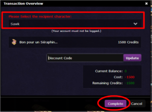 Dans la fenêtre qui s’affiche, sélectionner le personnage sur lequel vous souhaitez recevoir l’article, puis cliquez sur « Complete ».