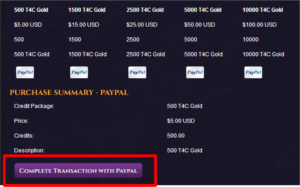 Choisissez le montant en T4C Gold souhaité et cliquez sur l’icône PayPal.